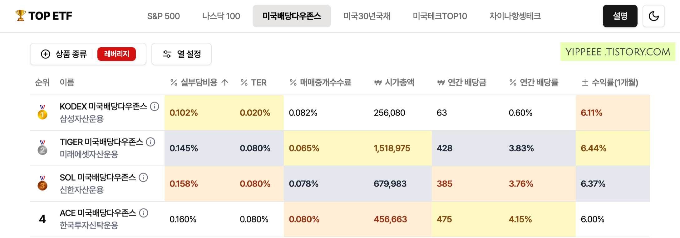참고로 사이트별 예시는 '미국배당다우존스'를 검색한 첫 화면입니다.